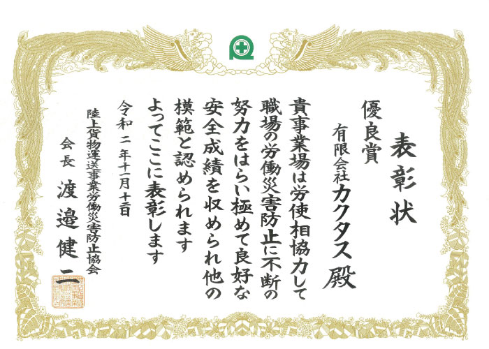 陸上貨物運送事業労働災害防止協会優良賞受賞